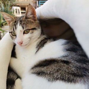 Der kleine Freddie kam im Mai 2024 im Örtchen Sfaka auf Kreta zur Welt. Mit seinen Schwestern und seiner Mama tauchte er eines Tages dort an einer Futterstelle der Kretapfötchen auf. Zu Anfang war er etwas schüchtern, aber nach einiger Zeit fasste er vertrauen und ließ sich gern kraulen und konnte schon schnurren wie ein Großer.